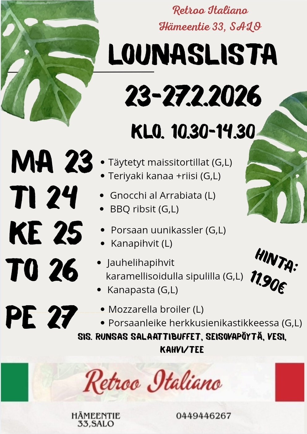 Lounasbuffet ma-pe klo 10.30-15.00 12,90 €, la klo 10.30-16.00 12,90 €, su ja pyhät klo 12.00-16.00 14,40 €. Keittolounas 10,90 € ( su ja pyhät 11,90 €). Hinta sisältää salaatin, maidon, jälkiruoan ja kahvin. Päivän leike ma-la klo 10.30-20.00 13,40 € ja su ja pyhät klo 12.00-19.45 14,90 €. Tervetuloa! Mahdollisuus myös ostaa mukaan. Lounaan ja leikkeen lisäksi myös AláCarte listallla olevat annokset. Voit tilata etukäteen soittamalla: 040 6548145 tai normaalisti kassalta paikan päältä, osoite: Koskikatu 1, 24240 SALO