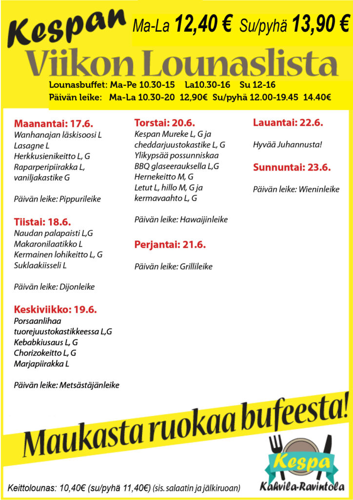 (hinnat sis. salaatin, maidon, jälkiruoan ja kahvin)